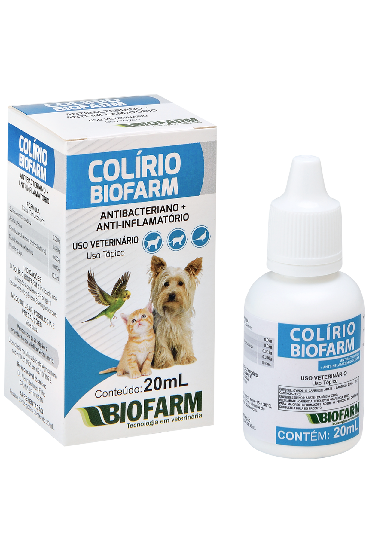 COLÍRIO BIOFARM é indicado nas infecções, lesões e irritações oculares que comumente afetam os animais domésticos. Pode ser utilizado em casos de lesões de córnea.